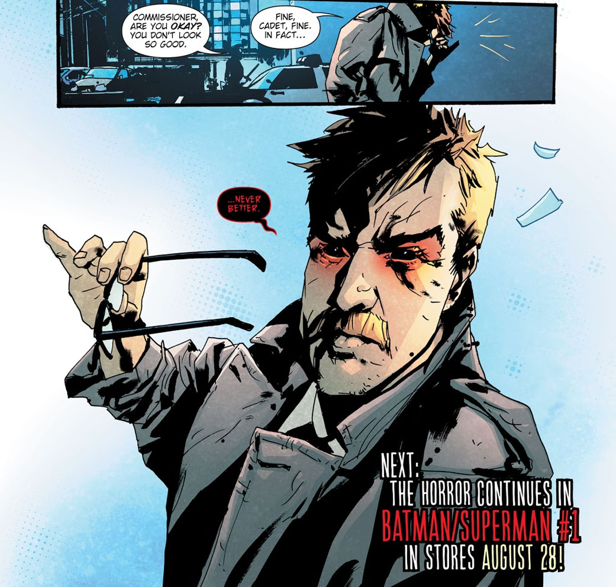 This week, Batman’s rematch with his evil counterpart, the Batman Who Laughs left the real Dark Knight victorious. However, the Batman Who Laughs may have gotten the last laugh in this case. On the final page, Scott Snyder and the artist known as Jock revealed that Commissioner James Gordon has been corrupted by the Batman Who Laughs. And Gordon has successfully hidden his new allegiance from everyone.